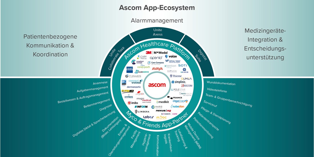 Mit der Ascom Healthcare Plattform verbinden Sie medizinische Geräte, klinische und nicht-klinische IT-Systeme sowie mobile Pflegeteams miteinander. Die bislang fragmentierten Daten werden zu permanent verfügbaren Informationen, um das klinische Personal bei ihrer täglichen Arbeit zu unterstützen. Durch unser App-Partner Ecosystem erweitern wir jetzt Ihre Möglichkeit zu einer noch bessere Pflege.